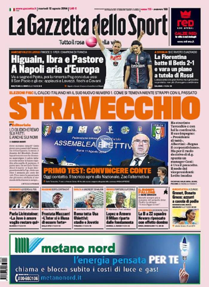RASSEGNA STAMPA GAZZETTA DELLO SPORT – Il calcio italiano ha il suo nuovo numero 1. Come si temeva, nessuno strappo con il passato. Il primo compito di Carlo Tavecchio sarà quello di convincere Antonio Conte ad accettare la sfida della Nazionale. Parla Lichtsteiner: “La Juve è amore, voglio restare qui”. Frustata Mazzarri: “L’Inter si è illusa di essere forte”. Roma tutta Usa. Obiettivi: stadio e Jovetic.