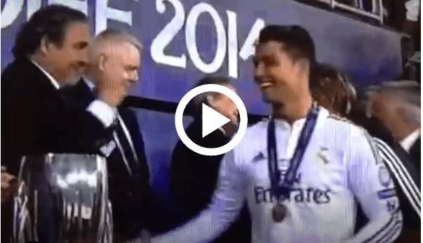 VIDEO CRISTIANO RONALDO PLATINI – Una medaglia sola per il Cristiano Ronaldo visto stasera non basta, deve averlo pensato anche Michel Platini, che con il portoghese ha dato vita a un simpatico siparietto dopo il match di Supercoppa. Il presidente del Uefa ha messo due medaglie al collo di CR7, due come i gol realizzati al Siviglia, da lì è partito un sorriso di intesa e uno scambio di battute. Eccovi le immagini, ma non è finita qui!