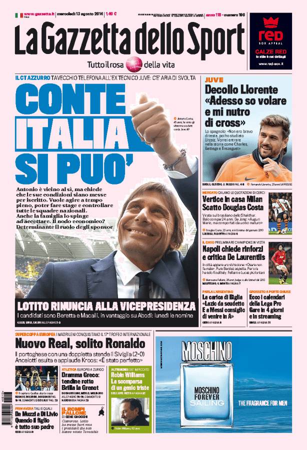 RASSEGNA STAMPA GAZZETTA DELLO SPORT – Antonio Conte è vicino al sì ma chiede che le sue condizioni siano messe per iscritto. Vuole agire a tempo pieno, poter fare stage e controllare tutte le squadre nazionali. Anche la famiglia lo spinge ad accettare. Il nodo economico? Determinante il ruolo degli sponsor. Decollo Llorente: “Adesso so volare e mi nutro di cross“. Nuovo Real, solito Ronaldo: il portoghese con una doppietta stende il Siviglia e regala la Supercoppa Europea ad Ancelotti che esulta ed applaude Kroos: “E’ stato perfetto”.