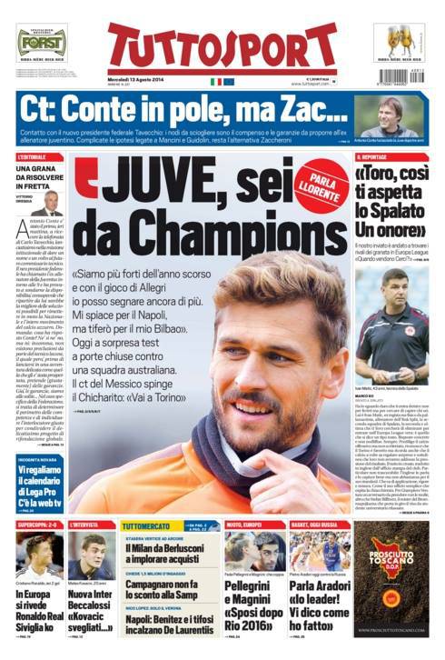 RASSEGNA STAMPA TUTTOSPORT – Parla Fernando Llorente: “Siamo più forti dell’anno scorso e con il gioco di Allegri io posso segnare di più. Mi spiace per il Napoli ma tiferò per il mio Bilba”. Oggi a sorpresa test a porte chiuse contro una squadra australiana. Il ct del Messico spinge il Chicarito Hernandes: “Vai a Torino”. C.T.: Conte in pole ma Zac… In Europa si rivede Ronaldo Real: Siviglia battuto per 2-0.