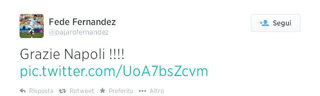 NAPOLI FERNANDEZ – “Grazie Napoli“. Questo è apparso poco fa sul profilo Twitter di Federico Fernandez, ormai ex difensore dei partenopei. Il trasferimento dell’argentino allo Swansea è ormai cosa fatta e il giocatore non ha esitato a ringraziare il suo vecchio club. Nelle prossime ore dovrebbe arrivare l’ufficialità dell’operazione di mercato.