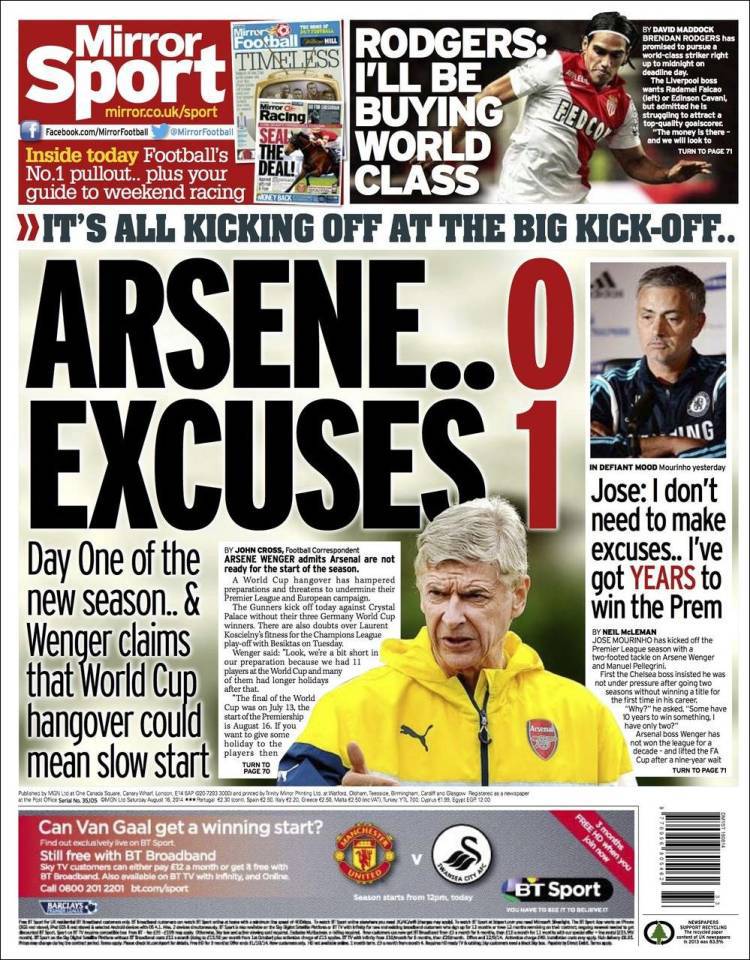 MIRROR SPORT WENGER – Oggi inizia ufficialmente la Premier League e in Inghilterra sono già iniziate le polemiche. Il Mirror ha attaccato Wenger che si è lamentato della scarsa forma dei giocatori reduci dal Mondiale.