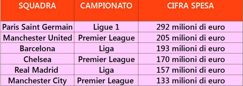 Non è certamente un caso, vista la crisi che attanaglia il nostro calcio ormai da diversi anni, che tra i 6 club più spendaccioni non risulti essere nessun club italiano: Liga e Premier League si dividono equamente la torta con un Paris Saint Germain che però domina la classifica visti i folli investimenti dello sceicco Nasser Al-Khelaifi, vero mattatore di queste ultime 5 sessioni. Male, se non malissimo a vedere soprattutto il rapporto legato alla scorsa stagione, il piazzamento del Manchester United: spese incredibili sì quelle dello scorso anno, che però hanno portato alla peggiore stagione del club da più di 25 anni a questa parte. Tra queste 6 squadre in elenco, quasi certamente, salterà fuori almeno una finalista della prossima Champions League, a segnale che l’equazione citata poco sopra spesso e volentieri risulta essere corretta.