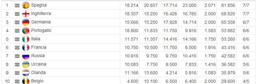 Preoccupante anche la classifica per nazioni: l’Italia è infatti al quinto posto, scavalcata anche dal Portogallo. Al primo posto c’è ancora la Spagna, poi Inghilterra e Germania.