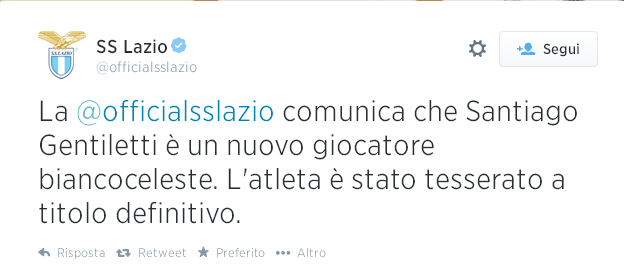 CALCIOMERCATO LAZIO – Nuovo acquisto in casa Lazio. E’ arrivata l’ufficialità attraverso il profilo Twitter del club capitolino: Santiago Gentiletti è un giocatore biancoceleste. Il giocatore, difensore classe ’85, arriva a titolo definitivo dal San Lorenzo