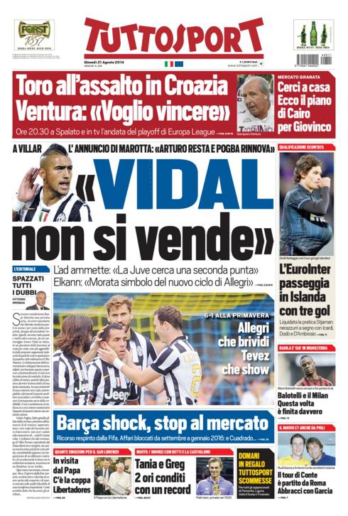 TUTTOSPORT VIDAL – A Villar Perosa arrivano le parole di Marotta che rassicura i tifosi della Juventus, Vidal resterà a Torino.