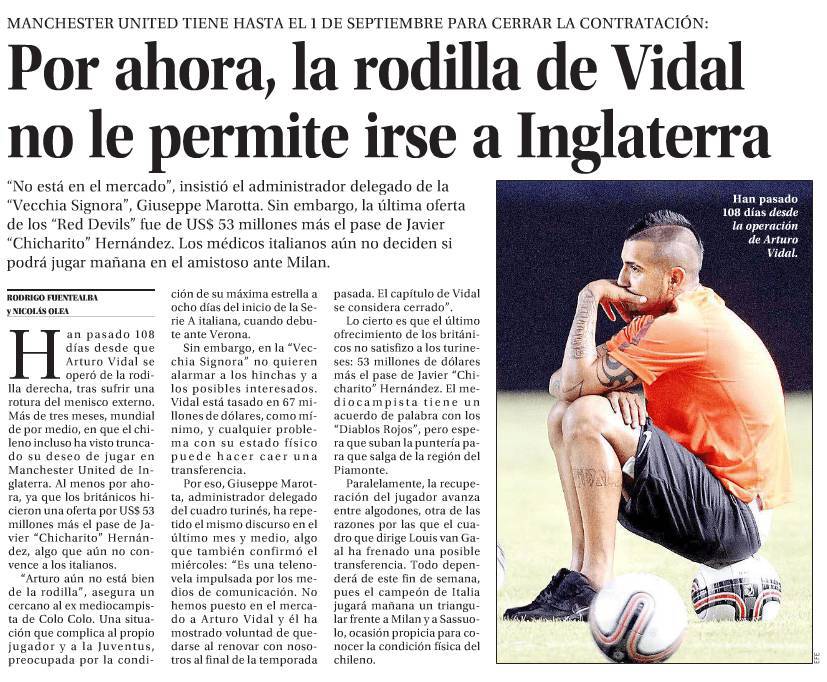 In Cile il quotidiano El Mercurio non ha dubbi. Il Manchester United ha presentato una nuova, ultima, offerta alla Juventus per Arturo Vidal. I red devils sarebbero pronti a mettere sul piatto 53 milioni di euro più il cartellino dell’attaccante messicano Hernandez. La Juventusm, ufficialmente, ha rifiututato l’ennesimo assalto del club inglese, ma secondo il giornale cileno i bianconeri vorrebbero in realtà prima valutare le condizioni del ginocchio del giocatore. E se il responso dei medici non dovesse essere del tutto positivo…Di seguito la foto dell’articolo.