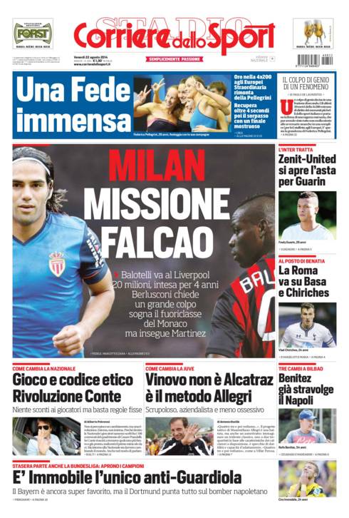 CORRIERE FALCAO – Il Milan cede Balotelli al Liverpool e sogna il grande colpo Radamel Falcao. L’alternativa è Martinez.
