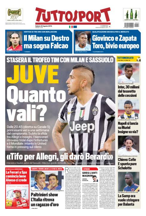 TUTTOSPORT JUVENTUS – Questa sera Trofeo Tim, in campo Milan, Juventus e Sassuolo. Tuttosport aspetta risposte dai bianconeri.