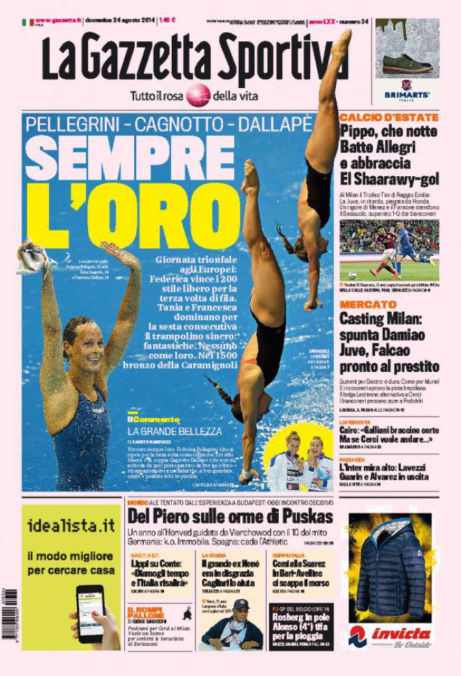 RASSEGNA STAMPA GAZZETTA DELLO SPORT – Prima pagina della Gazzetta dello Sport dedicata ai trionfi di Federica Pellegrini, oro nei 200 stile libero, di Tania Cagnotto e Francesca Dallapè che dominano per la sesta volta consecutiva il trampolino sincro. Calcio d’estate: Pippo, che notte. Batte Allegri e abbraccia El Shaarawy-gol. Casting Milan: spunta Damiao. Juve, Falcao pronto al prestito. Cairo: “Galliani braccino corte ma se Cerci vuole andare via…”.