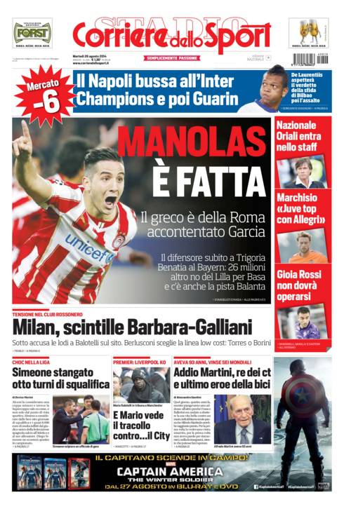 CORRIERE MANOLAS – La Roma ha praticamente preso Kostas Manolas, difensore greco dell’Olympiacos. Sarà l’erede di Benatia.