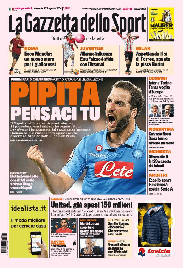 GAZZETTA HIGUAIN – Questa sera ritorno del preliminare di Champions per il Napoli contro l’Athletic Bilbao. I partenopei si affidano a Higuain.