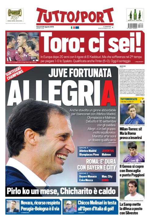 TUTTOSPORT JUVENTUS – Sorteggio Champions benevolo per la Juventus che sfiderà Atletico Madrid, Olympiakos e Malmoe.