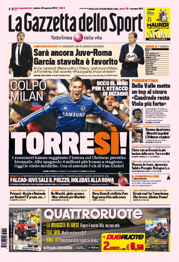 GAZZETTA TORRES – La Gazzetta dello Sport parla del colpo Milan che ha preso Torres dal Chelsea. Sarà il nuovo bomber.