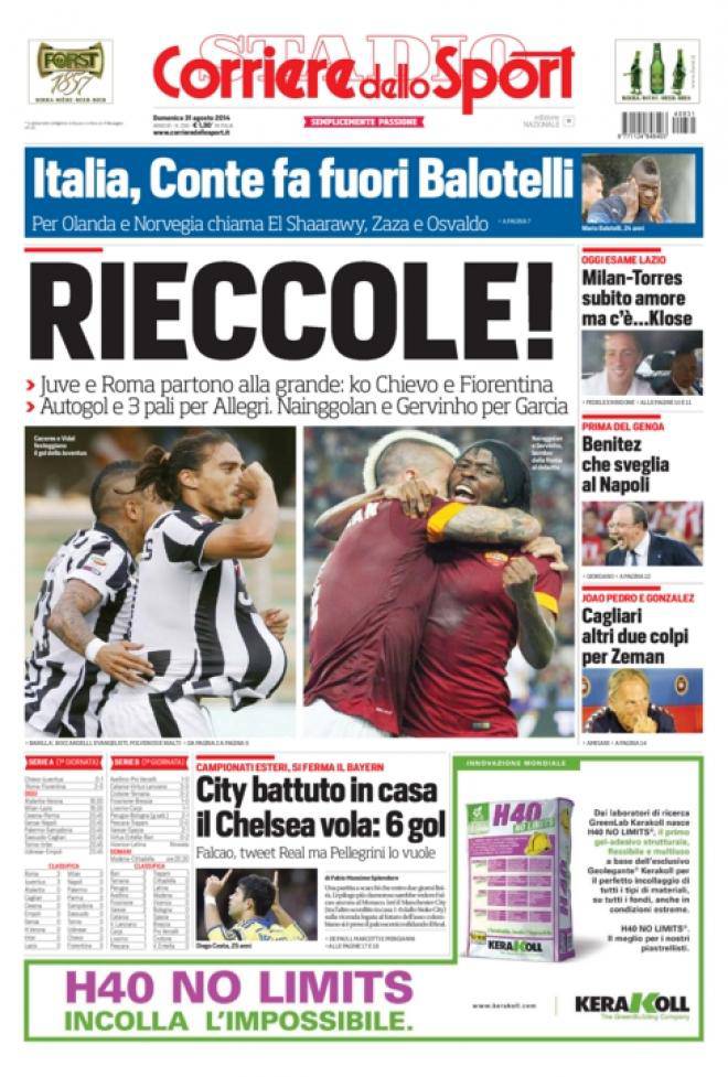 Juventus e Roma partono alla grande: ko Chievo e Fiorentina. Autogol e tre pali per Allegri. Nainggolan e Gervinho per Garcia. Italia, Conte fa fuori Balotelli. Milan-Torres, subito amore ma c’è… Klose. Banitez, che sveglia al Napoli.
