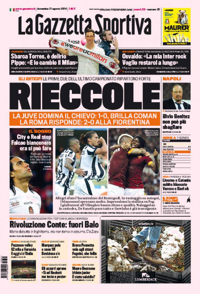 Prima pagina della Gazzetta dello Sport dedicata a Juventus e Roma. La prima e la seconda classificata dello scorso campionato hanno aperto la nuova serie A. La Juve domina il Chievo, brilla Coman. La Roma risponde: 2-0 alla Fiorentina. Sbarca Torres, è delirio. Pippo: “E io cambio il Milan”. Osvaldo: “La mia Inter rock. E voglio restarci a lungo”. Il sogno: City e Real stop, Falcao bianconero ora si può fare. Rivoluzione Conte: fuori Balotelli.