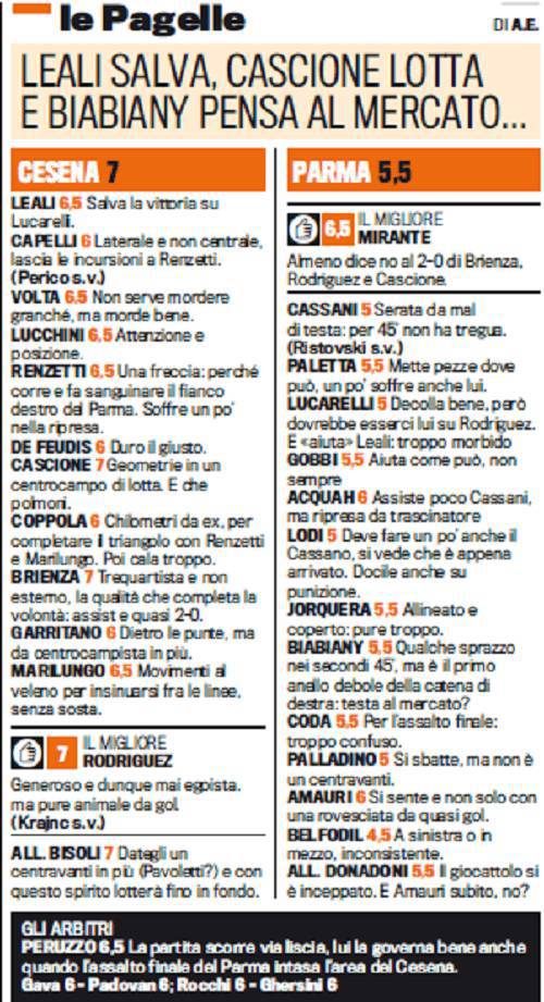 Prima vittoria del Cesena in Serie A che batte il Parma per 1-0 grazie al gol di Rodríguez. Il tutto con 10 italiani in campo che dimostrano che si può vincere e convincere anche senza tantissimi stranieri. Il Cesena vive di entusiasmi mentre il Parma aspetta con ansia che finisca il mercato. Nei voti e nelle pagelle della Gazzetta dello Sport, nel Cesena, il migliore è stato Rodríguez, sempre generoso e mai egoista. Nel complesso, la squadra di Bisoli ottiene voti alti. Tutto da rivedere, invece, nel Parma dove il migliore è il portiere Mirante che nega il 2-0 a Mirante. Male, invece, Beldfodil e Biabiany che sembrava avere la testa al mercato.