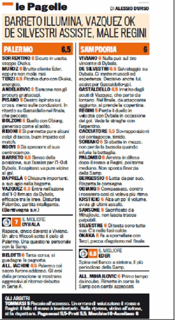 E’ finita 1-1 la gara tra Palermo e Sampdoria. I rosanero, guidati da Iachini, tornano in serie A con lo spirito giusto per acciuffare il prima possibile la salvezza e togliersi qualche soddisfazione in più. Merito di un Paulo Dybala che, dopo diverso tempo, è riuscito a scrollarsi di dosso la responsabilità dei 12 milioni pagati per lei da Zamparini si è trasformato nel Lionel Messi della Sicilia trascinando la sua squadra verso una prestazione importante. I rosanero, però, dopo essere andati in vantaggio proprio con Dybala non sono riusciti a chiudere il match dopo che la Samp era rimasta in dieci per l’espulsione di Regini e così, nel finale, è arrivata la beffa con il gol del pareggio di Gastaldello. Nelle pagelle della Gazzetta dello Sport, tra i siciliani, il voto più alto va a Dybala mentre tra i doriani il migliore è stato Eder.