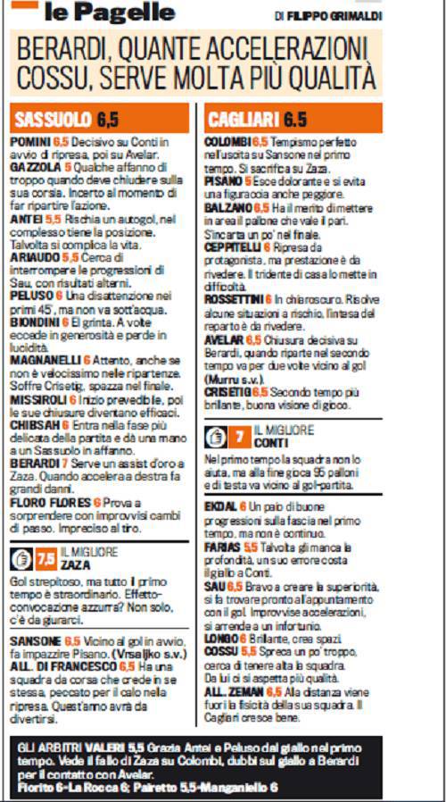 Un anno e mezzo dopo l’esonero dalla Roma, Zdenek Zeman torna in panchina con il Cagliari e, contro il Sassuolo, ripropone la sua filosofia di gioco, compresi gli 8 uomini a centrocampo al fischio d’inizio. L’unica nota stonata sono i gol. Appena due, uno per parte. Fantastica la rete del Sassuolo firmata da Simone Zaza. Il giovane attaccante di Di Francesco, festeggia con un fantastico tiro al volo la convocazione in Nazionale di Antonio Conte. Ai toscani risponde Sau che regala il pareggio alla squadra di Zeman. Nelle pagelle della Gazzetta dello Sport promosse a pieni voti entrambe le formazioni. Nel Cagliari, il migliore è stato sicuramente Conti, capace di guidare come al solito la squadra. 7.5 per Zaza che non solo segna un gol strepitoso ma è l’autore di una prestazione eccellente soprattutto nel primo tempo. Voti e pagelle della Gazzetta dello Sport.