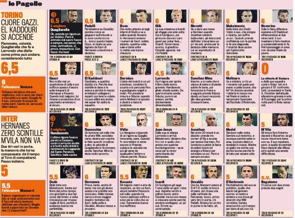 L’Inter non va oltre lo zero a zero sul campo del Torino, anzi, la squadra nerazzurra rischia anche di perdere visto il rigore parato da Samir Handanovic che neutralizza Larrondo. Uno a zero a zero che porta anche alle prime polemiche arbitrali da parte di Mazzarri poco contento della direzione di gara di Doveri che concede il rigore per un fallo di Vidic su Quagliarella e non vede un intervento simile di Glik su Icardi. C’è anche il rosso a Vidic nel finale per un applauso al direttore di gara. Bene Quagliarella nel Torino, ottimo Handanovic nell’Inter, voti e pagelle della Gazzetta dello Sport.