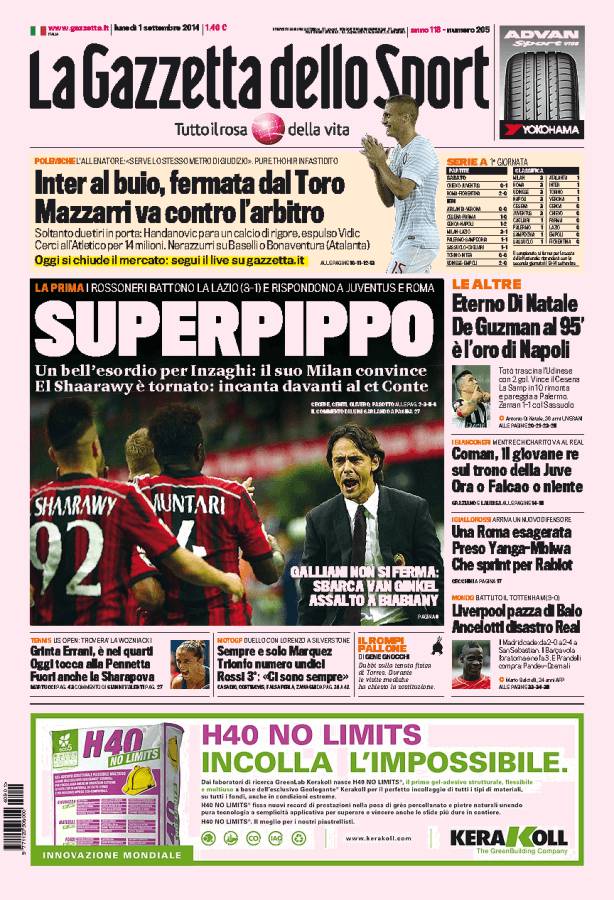 GAZZETTA MILAN – Inizia benissimo l’avventura di Inzaghi sulla panchina del Milan, tre a uno alla Lazio di Pioli nella prima giornata di campionato.