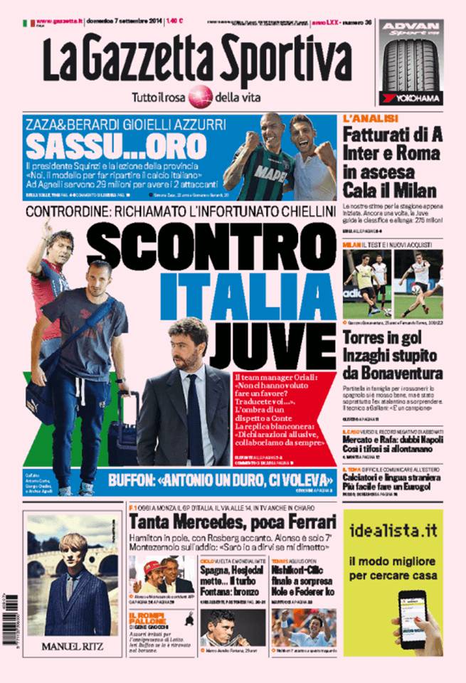Prima pagina della Gazzetta dello Sport dedicata allo scontro Italia-Juventus dopo il richiamo da parte della società bianconera di Giorgio Chiellini a Torino. Zaza e Berardi, gioielli azzurri. Fatturati di A: Inter e Roma in ascesa. Cala il Milan. Torres in gol. Inzaghi stupito da Bonaventura.