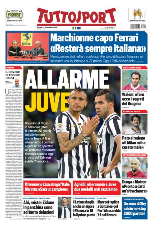 Anche Tuttosport ovviamente parla del doppio infortunio di Vidal e Tevez. Prime critiche allo staff tecnico di Allegri.