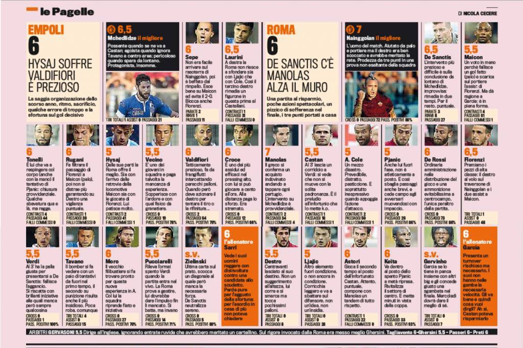 Con il cinismo della grande squadra, pur non giocando la sua partita migliore, la Roma batte l’Empoli per 1-0 e porta a casa i tre punti della vittoria che le consentono di restare a punteggio pieno in testa alla classifica insieme alla Juventus. Rispetto allo scorso anno, nonostante la partenza di Benatia, i giallorossi dimostrano di avere una difesa di ferro con zero gol subiti in due partite. Grande protagonista della retroguardia giallorossa è il greco Manolas che, in sole due uscite, è già diventato il leader della difesa. Il migliore della squadra di Garcia, tuttavia, nei voti della Gazzetta dello Sport, è sicuramente Radja Nainggolan che, non solo recupera un’infinità di palloni ma propizia l’autogol che vale la vittoria. Nell’Empoli, invece, promosso Mchedlidze capace di liberarsi della possente marcatura di Castan.