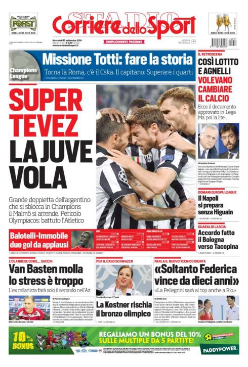 Anche il Corriere dello Sport omaggia la vittoria della Juventus contro il Malmoe per due a zero con un Tevez strepitoso.