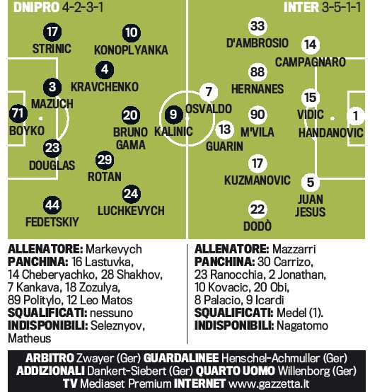 Giovedì di Europa League per le squadre italiane e quindi anche per l’Inter di Walter Mazzarri che giocherà in Ucraina contro il Dnipro. Partita difficile per condizioni climatiche e ambientali, Mazzarri lancia dal primo minuto Fredy Guarin in appoggio alla punta Osvaldo: a centrocampo torna M’Vila con Hernanes e Kuzmanovic, a sinistra Dodò e a destra D’Ambrosio. In difesa si rivede Campagnaro che giocherà con Vidic e Juan Jesus. Nel Dnipro particolari attenzioni per la stella Konoplyanka che in estate ha ricevuto molte offerte tra cui quella della Roma. Le probabili formazioni secondo la Gazzetta dello Sport.