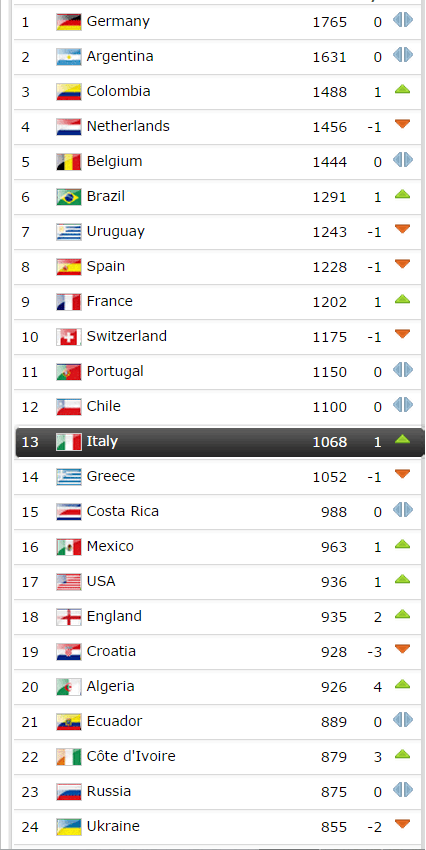 13esima l’Italia che, nonostante il tracollo in Sud America, guadagna un gradino a discapito della Grecia, grazie soprattutto al buon esordio con Conte, subito seguita dalla Costa Rica 15esima.