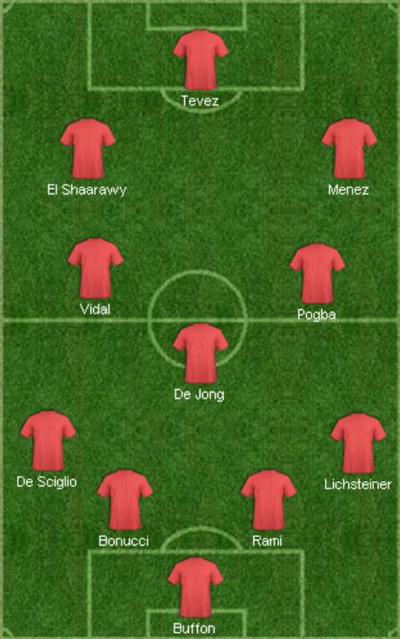Fondendo ipoteticamente i migliori giocatori del Milan e quelli della Juventus che squadra si potrebbe schierare in campo? Attualmente verrebbe fuori un 4-3-3 di primo livello. In porta non ci sono dubbi: Buffon. Retroguardia che vede Lichsteiner a sinistra e De Sciglio a destra; per quanto riguarda i centrali trovano posto Chiellini e, volendo scegliere un rossonero, Rami. In mezzo al campo spazio a De Jong davanti alla difesa con Pogba e Vidal liberi ai suoi fianchi. In attacco Tevez viene affiancato da Menez ed El Shaarawy. Una formazione del genere sicuramente lotterebbe fino in fondo per lo Scudetto ma in Europa come si comporterebbe? Qui sospendiamo ogni giudizio. Sarebbe interessante testarlo sul campo ma per ovvi motivi ciò risulta impossibile.