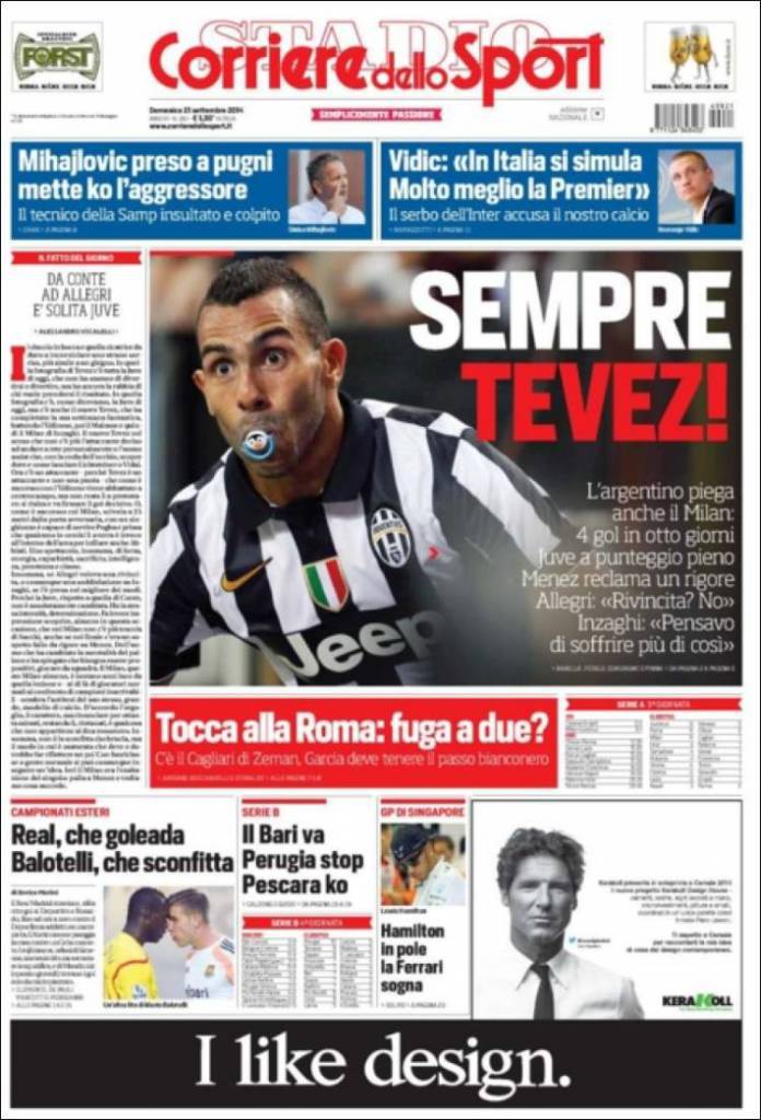 Carlitos Tevez piega anche il Milan: quattro gol in otto giorni. Juve a punteggio pieno. Menez reclama un rigore. Allegri: “Rivincita? No”. Inzaghi: “Pensavo di soffrire più di così”. Tocca alla Roma contro il Cagliari: fuga a due? Mihajlovic preso a pungi mette ko l’aggressore. Vidic: “In Italia si simula, molto meglio la Premier”.
