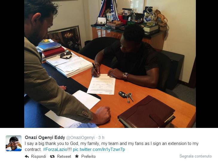 Onazi ha ufficialmente rinnovato il contratto con la Lazio. Il centrocampista nigeriano ha ufficializzato l’operazione postando sul proprio profilo Twitter la foto del momento della firma. Il giocatore è stato vicino in estate a lasciare il club capitolino proprio per il mancato prolungamento. Ecco il comunicato della società: “La S.S. Lazio comunica che il calciatore Ogenyi Eddy Onazi ha rinnovato il suo contratto”.