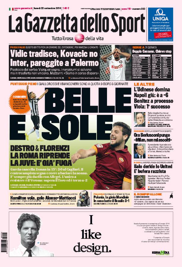 Dopo tre giornate di campionato Juventus e Roma sono da sole in testa alla classifica. La Gazzetta dello Sport parla dell’ennesimo duello tra le due compagini.