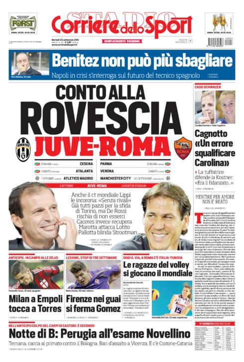 Il Corriere dello Sport parla della grande sfida di Torino tra Juventus e Roma che arriverà tra tre giornate. Una sfida tra le due regine del campionato.