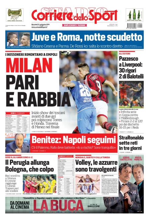 Anche il Corriere dello Sport parla del pareggio del Milan a Empoli con Torres e Honda che acciuffano la squadra di Sarri.