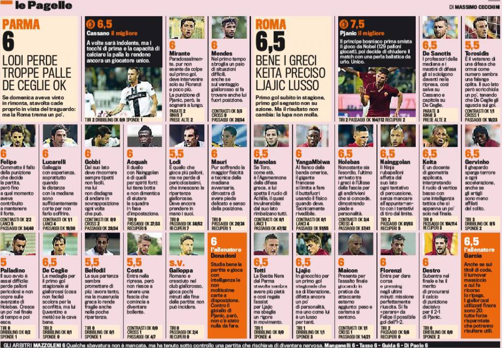 La Roma vince due a uno a Parma grazie a una magia di Pjanic su punizione nel finale. Un gol alla Maradona, così lo hanno descritto gli addetti ai lavori. Proprio il bosniaco è il migliore in campo della Roma: per lui non solo il gol decisivo ma anche tante giocate di qualità. Bene anche il debutto di Holebas, terzino sinistro greco che si è ben disimpegnato sulla fascia mancina al posto di Cole. Nel Parma Cassano lotta come può, il genio di Bari vecchia cerca di illuminare il gioco ma non è accompagnato a dovere dai propri compagni. Voti e pagelle della Gazzetta dello Sport.