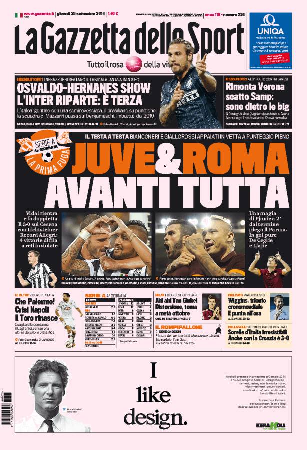 La Gazzetta dello Sport parla del duello a distanza tra Juventus e Roma che continuano a vincere in campionato.