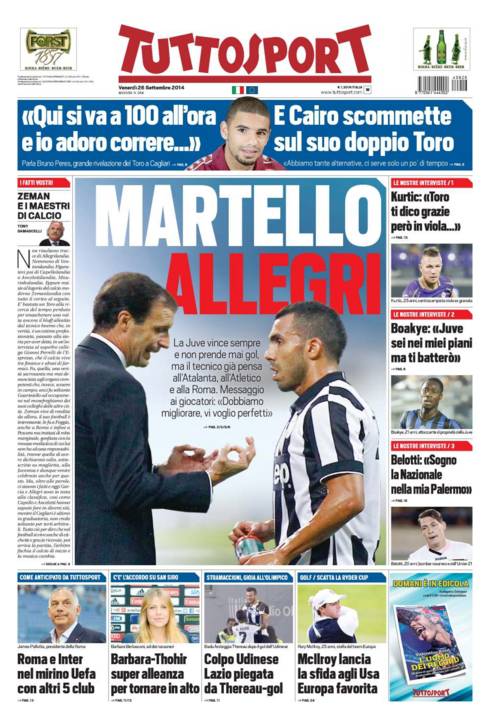 Su Tuttosport si parla di Allegri che continua a martellare la squadra per fare sempre meglio in campionato e in Champions.