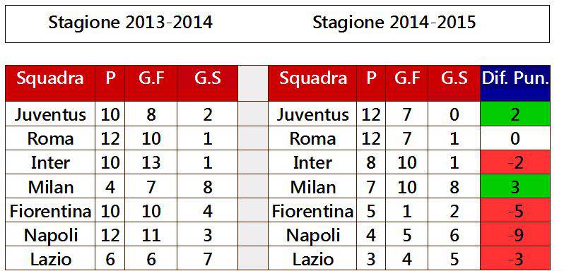 Prosegue il confronto portato avanti dalla redazione di Calciomercatonews.com tra quanto fatto dalle big della Serie A in queste due ultime stagioni. Siamo ormai giunti alla 4^ giornata e, rispetto a quanto fatto lo scorso anno, è evidente come siano molte le squadre ad essere partite nettamente peggio. La Juventus continua in positivo avendo recuperato due punti rispetto alla stagione 2013-2014. Rispetta quanto buono di fatto 12 mesi fa la Roma di Garcia: 12 punti lo scorso anno, 12 punti anche quest’anno. Male, malissimo il Napoli: addirittura meno 9 rispetto al campionato 13-14.