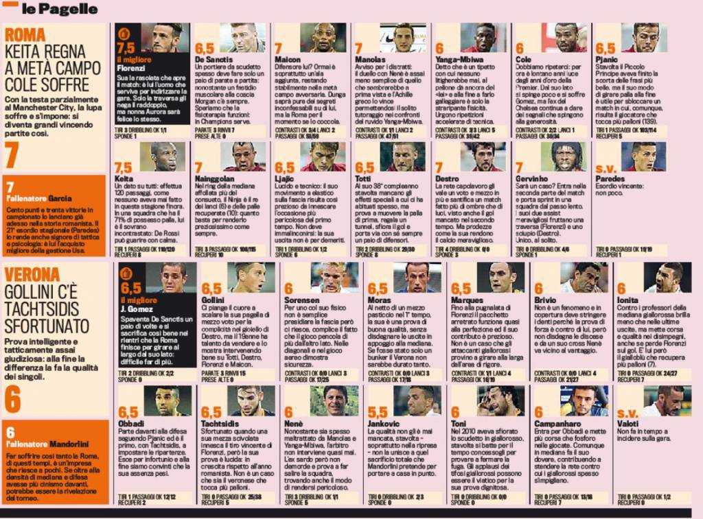 Anche la Roma, come la Juventus, non perde un colpo. Nel giorno del 38esimo compleanno di Francesco Totti, Alessandro Florenzi e Mattia Destro hanno regalato la sesta vittoria consecutiva, tra campionato e coppe ai giallorossi. Per battere l’Hellas Verona di Mandorlini, bravo a chiudere tutti gli spazi, però, è servita molto pazienza. L’1-0, infatti, è arrivato al 75′ del secondo tempo con un tiro dalla distanza del centrocampista giallorosso e undici minuti dopo è arrivata anche la magia di Mattia Destro da metà campo. Nelle pagelle della Gazzetta dello Sport il migliore è Florenzi, bravo a farsi trovare sempre pronto ogni volta che Garcia lo manda in campo. Benissimo ancora una volta Manolas mentre fatica ancora un po’ Ashley Cole. Nel Verona, invece, il migliore è Gomez, capace di spaventare Morgan De Sanctis.