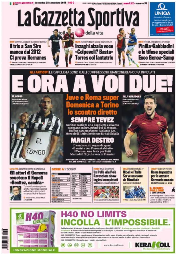 Juventus e Roma super. Domenica a Torino lo scontro diretto. Sempre Tevez: Carlitos realizza una doppietta e diventa capocannoniere, primo gol di Morata. Mercoledì l’Atletico che ne fa 4 al Siviglia. Magia Destro: il centravanti segna da quasi 40 metri e con Florenzi abbatte il Verona. Martedì il City che vole in Premier.