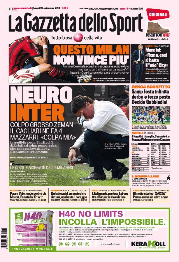 La Gazzetta dello Sport parla ovviamente del k.o. casalingo dell’Inter contro il Cagliari per quattro a uno. Un punteggio già acquisito dai sardi nel primo tempo.
