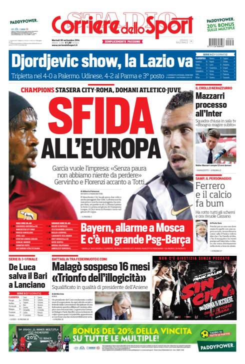 Anche il Corriere dello Sport parla della due giorni di Champions League. Inizia la Roma questa sera contro il City, domani la Juventus sfiderà l’Atletico Madrid.