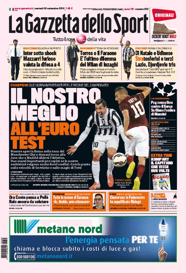 La Gazzetta dello Sport parla della due giorni di Champions che si aprirà questa sera con la Roma che farà visita al Manchester City.