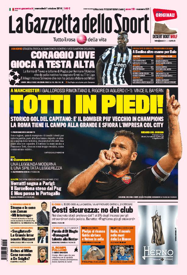 La Gazzetta dello Sport omaggia Francesco Totti che ieri ha segnato il gol del pareggio contro il Manchester City diventando il giocatore più anziano a segnare in Champions.