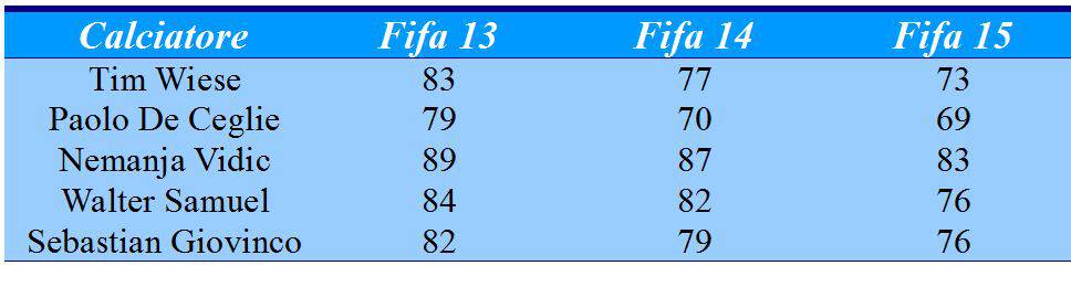 E’ disponibile ormai per tutte le console, già da qualche giorno, FIFA 15, simulazione calcistica prodotta dalla nota casa statunitense EA Sports. Il videogioco è subito diventato, come prevedibile, uno dei titoli più venduti in assoluto. C’era grande attesa infatti, alla vigilia, da parte di tutti i videogiocatori per l’uscita di questo fenomenale videogame che terrà incollati migliaia di appassionati alla console per tutta la stagione. Seguendo un po’ l’evoluzione dei valori dei calciatori all’interno del noto gioco, dopo avervi svelato nelle scorse quali sarebbero stati i 50 più forti calciatori in FIFA 15, abbiamo deciso di analizzare, anche grazie ai dati forniti da Sofifa.com, i calciatori che da Fifa 13 ad oggi hanno subito un vero e proprio tracollo nei valori. Un’analisi certamente impietosa che però vi farà riflettere molto sull’andamento di questi 5 calciatori nelle ultime 3 stagioni. Eccovi l’interessante grafica: