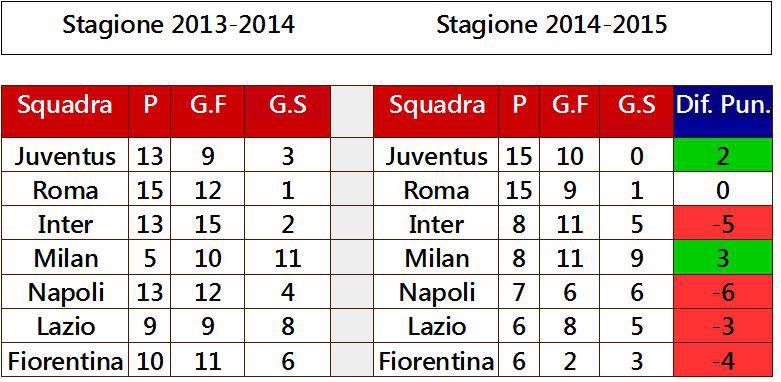 Prosegue il confronto di Calciomercatonews.com sull’andamento delle big nelle due ultime stagioni. Arrivati alla 5^ giornata, ed essendo alle porte della 6^, appare evidente come ben quattro squadre su sei, tra le big del nostro campionato, stiano facendo nettamente peggio rispetto alla scorsa stagioni. Inter e Napoli stanno attualmente raccogliendo molti meno punti della scorsa annata, mentre in positivo vanno soltanto la Juventus ed il Milan. Parità netta per la Roma di Rudi Garcia che bissa, alla 5^ giornata, la splendida partenza della scorsa stagione: sin qui 5 vittorie su 5.