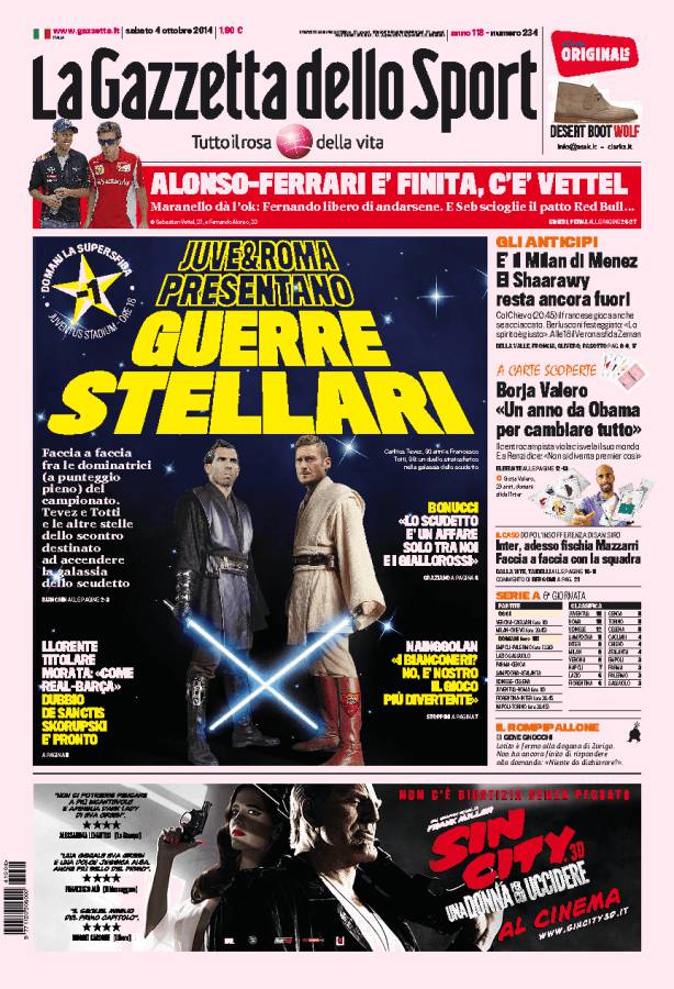 Prendendo spunto dall’immagine del film Guerre Stellari, la Gazzetta dello Sport presenta la super sfida di domani pomeriggio tra Juventus e Roma.
